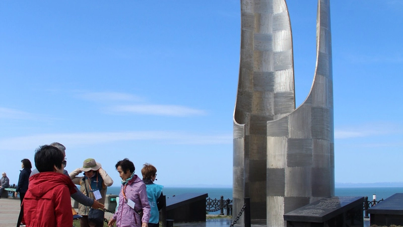 В порту Корсаков южнокорейских туристов встретили хлебом с солью и народными песнями. Вскоре состоялась и первая обязательная остановка – на корсаковской горе Печали. Здесь в 2007 году был установлен монумент из металла в память о разделенных семьях трудовых мигрантов из Кореи, которые испытали множество тягот и лишений в период японской эпохи колонизации Сахалина.