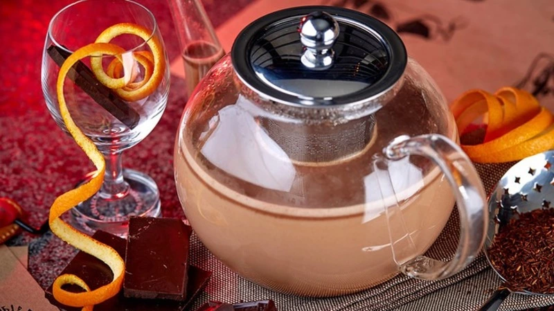 Чайная ложка чая «Эрл Грей», чайная ложка ройбуша, 50 г горького шоколада, чайная ложка цедры апельсина, 200 мл миндального молока, 200 мл чистой воды.