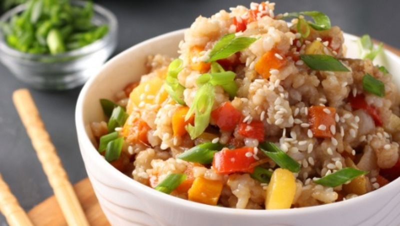 Рис круглый – 200 г, кабачок – 200 г, перец болгарский – 2-3 шт., морковь – 1 шт., лук – 1 шт., чеснок – 1 зубчик, корень имбиря – 2 см, соевый соус – 4 ст. л., рисовый уксус – 2 ст. л., коричневый сахар – 1 ст. л., соль, перец – по вкусу, растительное масло – 3 ст. л., зеленый лук и кунжут белый – для подачи.