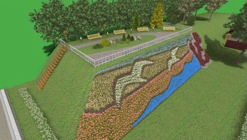 Проект предлагает уникальное сочетание природной красоты и функционального комфорта. Территория оформляется как террасированный склон с яркими цветниками, декоративными кустарниками, газонами и пешеходными дорожками. В верхней части склона — площадка с удобными скамейками и элементами ландшафтного дизайна. Предусмотрена лестница с перилами для безопасного подъема. Это уютное место для неспешного отдыха, уединения и наслаждения природой в черте города.
